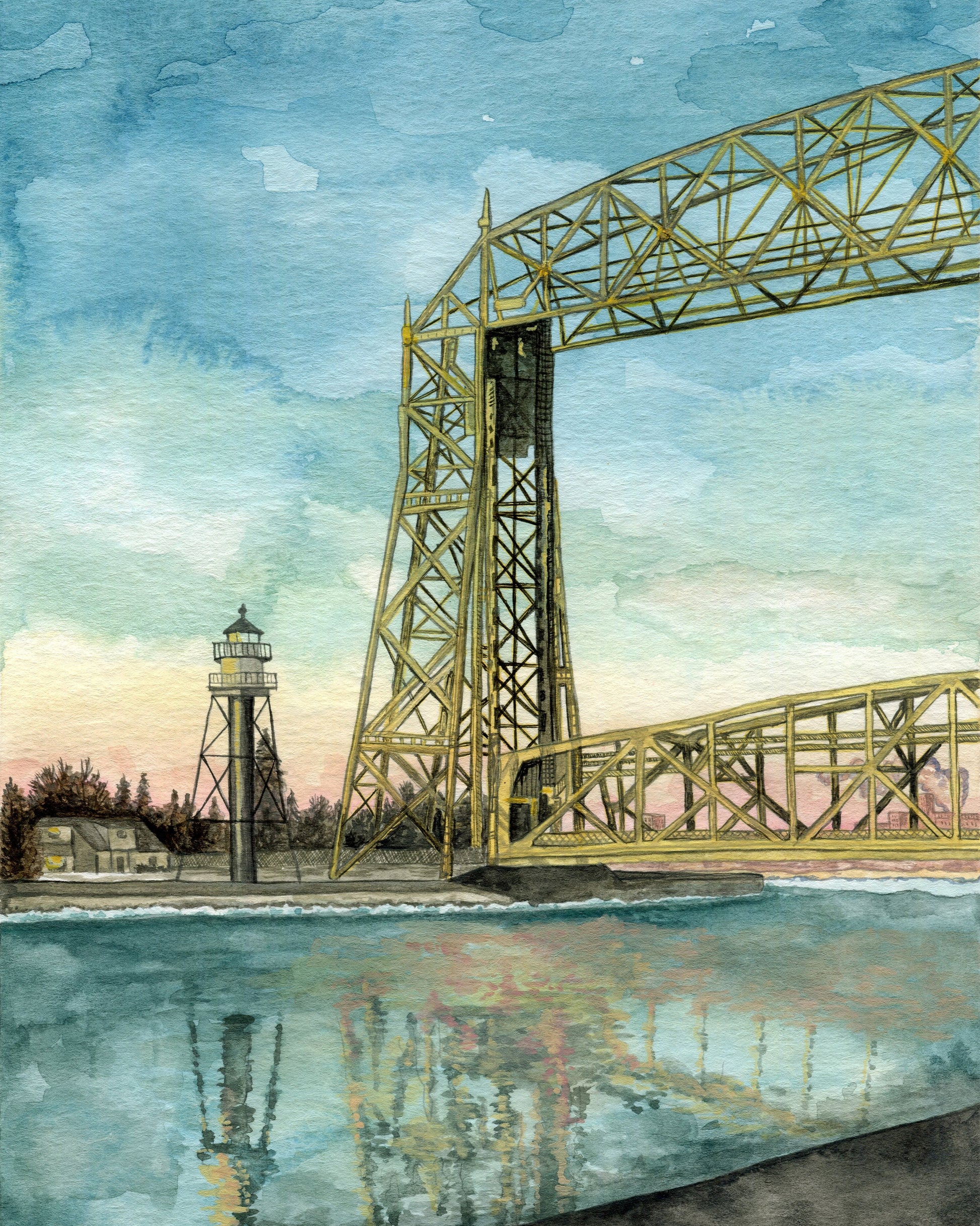 This painting offers a striking representation of Duluth's maritime heritage through the Aerial Lift Bridge and the serene beauty of a winter landscape. The painting contrasts the sharp, architectural lines of the bridge’s metal frame with the soft, flowy watercolor sky in the background.