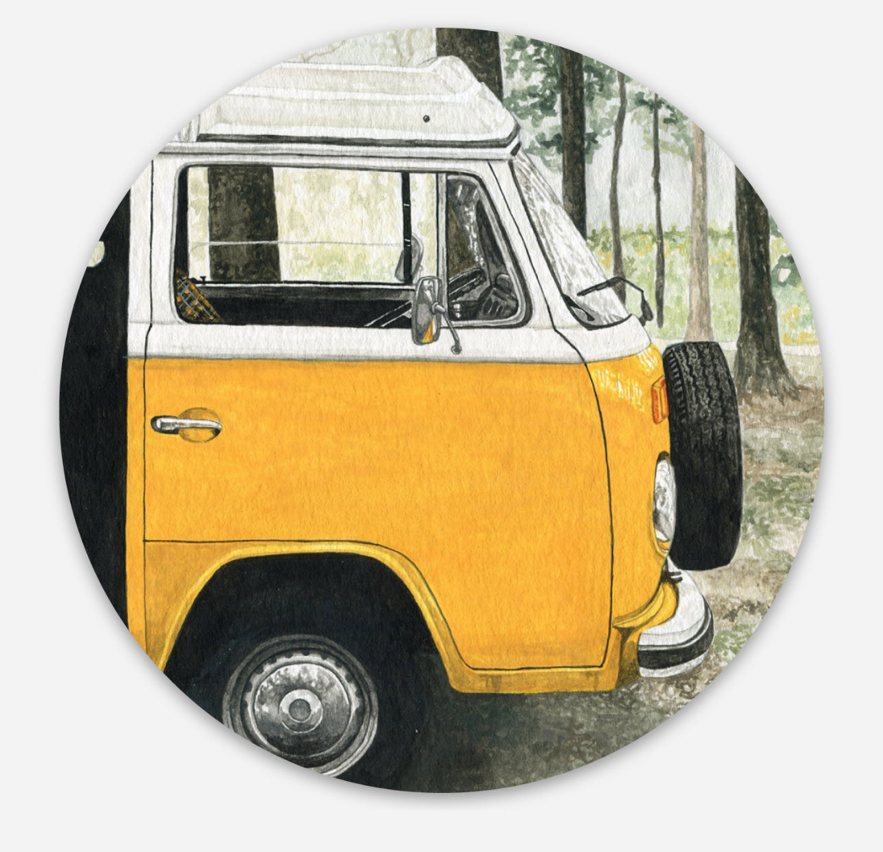 Embrace retro charm with our sticker featuring a vintage Volkswagen Bus nestled in the woods. This design captures the classic beauty of the iconic bus, highlighting its distinctive style and character with meticulous detail. The bus pops against a backdrop of soft, flowing watercolor effects, creating a delightful contrast between the detailed vehicle and the serene, ethereal forest setting. Perfect for adding a touch of adventure and timeless style to your laptop, water bottle, or notebook, this sticker is ideal for anyone who loves classic cars and the tranquility of nature.